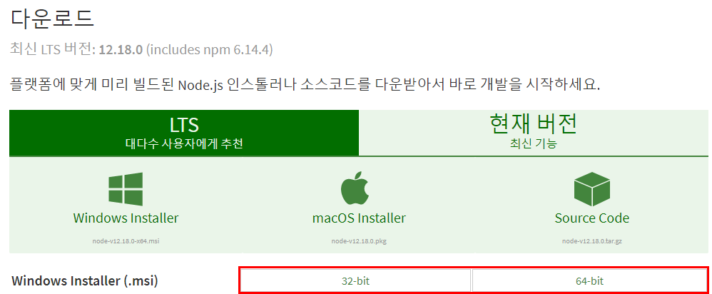 Nodejs 공식 홈페이지 접속 -> 내 운영체제에 맞는 .msi 파일 다운로드 후 설치