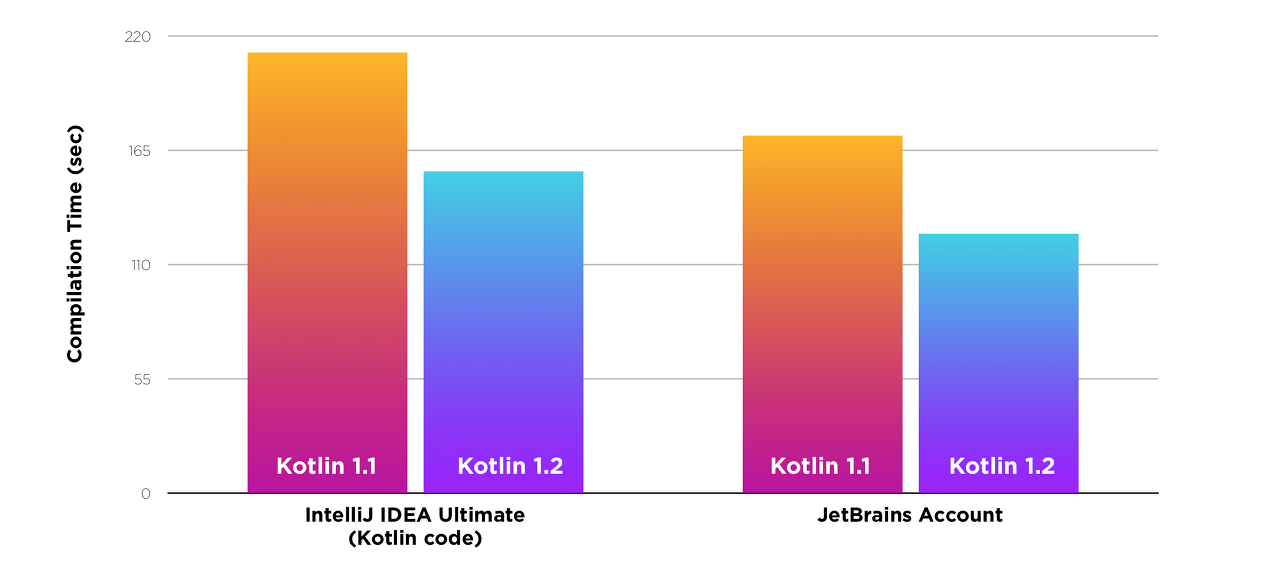 1.2 개발 기간 동안 컴파일 프로세스를 더 빠르게 만드는 데 많은 노력을 기울였습니다. 이미 Kotlin 1.1 대비 약 25%의 개선을 이루어냈으며, 1.2.x 업데이트에서 더 큰 개선 가능성을 볼 수 있습니다.