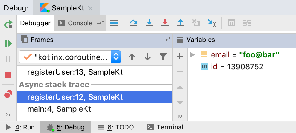 디버깅을 위해 suspend 함수 또는 람다 내에서 중단점에서 멈출 때(예: 라인 13에서), "비동기 스택 추적"은 추가로 중단 지점의 변수 상태(라인 12에서의 상태)를 보여줍니다. 현재 코루틴에서 마지막 중단 지점(라인 12 및 4)부터 시작하는 중단 함수 스택 트레이스 전체를 검색하고 변수의 저장된 값을 확인할 수 있습니다.
