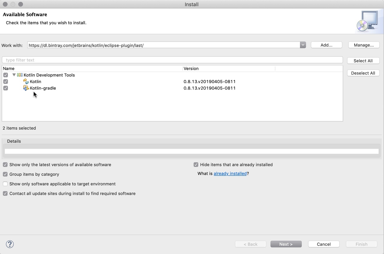 실험적인 Gradle 통합은 업데이트 사이트 https://dl.bintray.com/jetbrains/kotlin/eclipse-plugin/last/를 통해 설치할 수 있습니다. Eclipse의 도움말 메뉴에서 새로운 소프트웨어 설치 대화상자를 열고 업데이트 사이트 URL을 입력하고 Kotlin-gradle을 선택하십시오.