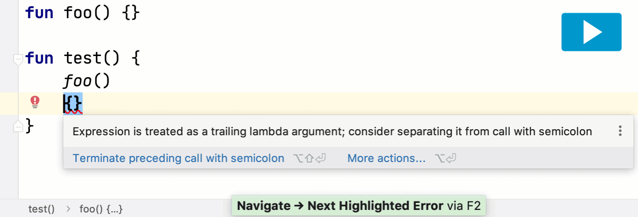 이제 이러한 경우를 위한 오류 메시지가 개선되었으며 이를 자동으로 수정할 수 있습니다. 이전 줄 끝에 세미콜론을 삽입하면 됩니다. (네, Kotlin에서는 가끔 세미콜론이 필요합니다!)