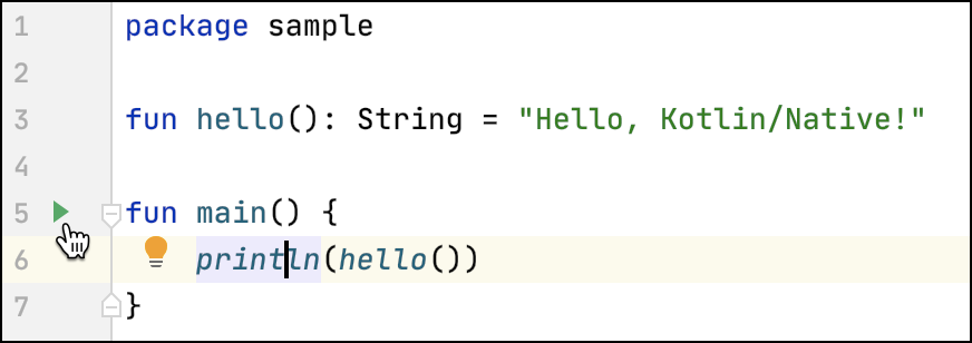 이전에는 Kotlin/Native 코드를 터미널에서 실행하거나 IntelliJ IDEA에서 Gradle 작업을 실행하여만 실행할 수 있었습니다. 이제 다른 Kotlin 코드와 유사하게 거터 아이콘을 사용하여 쉽게 실행할 수 있습니다.