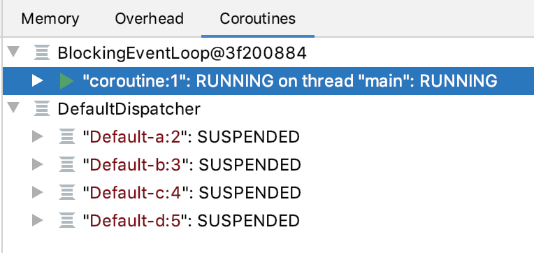 이 탭에서는 현재 실행 중인 코루틴과 일시 중단된 코루틴에 대한 정보를 찾을 수 있습니다. 코루틴은 해당하는 디스패처로 그룹화됩니다. 사용자 정의 이름으로 코루틴을 시작한 경우, 도구 창에서 해당 이름으로 찾을 수 있습니다. 다음 예에서는 메인 코루틴이 실행 중임을 볼 수 있으며(우리는 그 안에서 중단점에 멈춰 있습니다), 다른 네 개의 코루틴은 일시 중단되어 있음을 볼 수 있습니다.