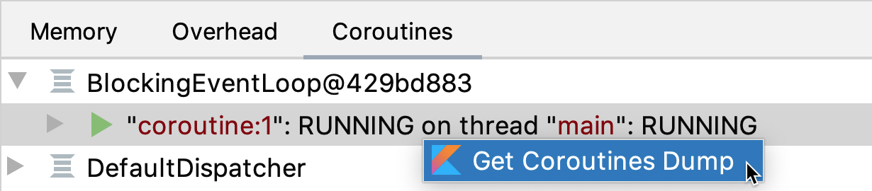 '코루틴 덤프 가져오기' 옵션을 사용하여 각 코루틴의 상태와 스택을 포함한 전체 보고서를 얻을 수 있습니다.