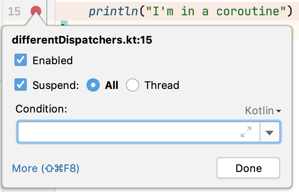 일시 중단된 코루틴의 상태를 확인하려면 중단점에 "Suspend: All" 옵션을 선택해야만 디버거가 중단합니다.