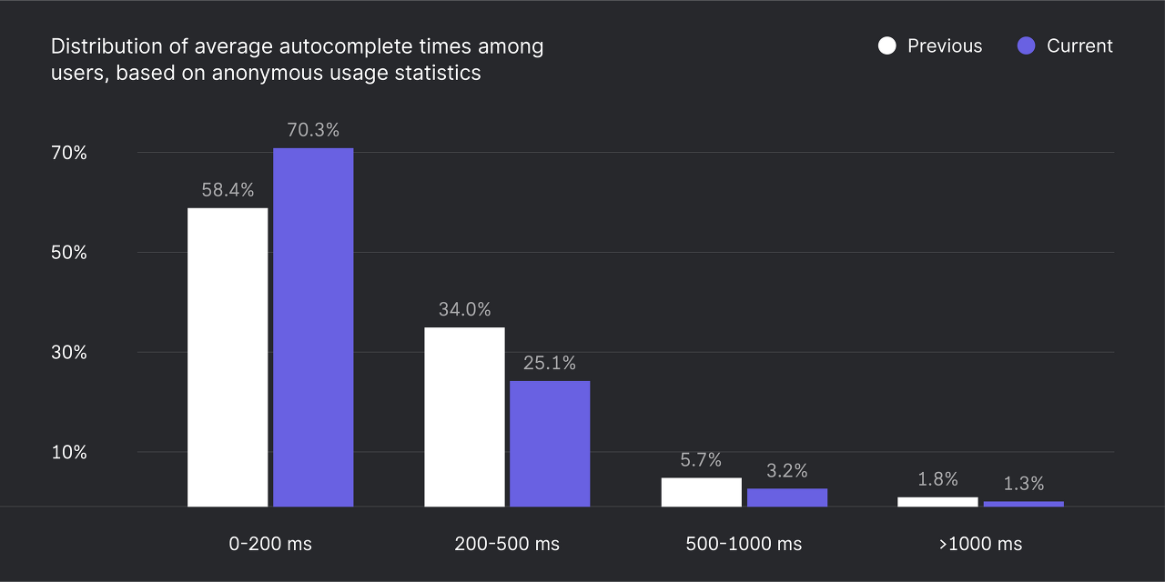 또한 자동 완성 제안이 나타나는 시간을 크게 개선했습니다. 다음 그래프는 Kotlin 사용자가 경험하는 평균 자동 완성 응답 시간을 개요로 보여줍니다. 완성이 500ms 이상 걸리는 경우의 수가 거의 절반으로 줄었습니다.