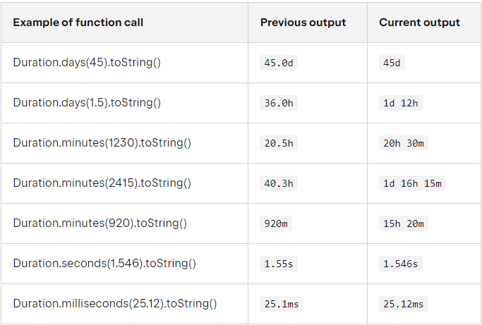 일부 경우, 직렬화 및 교환을 포함하여 Duration.toString() 대신 보다 엄격한 ISO-8601 형식을 사용하는 Duration.toIsoString()을 사용하는 것이 좋습니다.