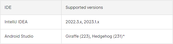 Kotlin 1.9.0을 지원하는 Kotlin 플러그인은 다음과 같은 IDE에서 사용할 수 있습니다: