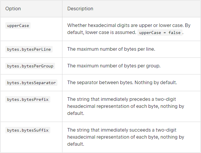 HexFormat 클래스에는 HexFormat{} 빌더를 사용하여 구성할 수 있는 형식 옵션이 포함되어 있습니다.