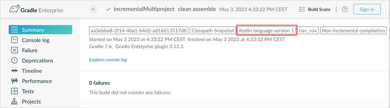 Gradle 빌드 보고서에서 현재 또는 K2 컴파일러를 사용하여 코드를 컴파일한 것인지를 확인할 수 있습니다. Kotlin 1.9.0에서 Gradle 빌드 스캔에서 이 정보를 볼 수 있습니다.