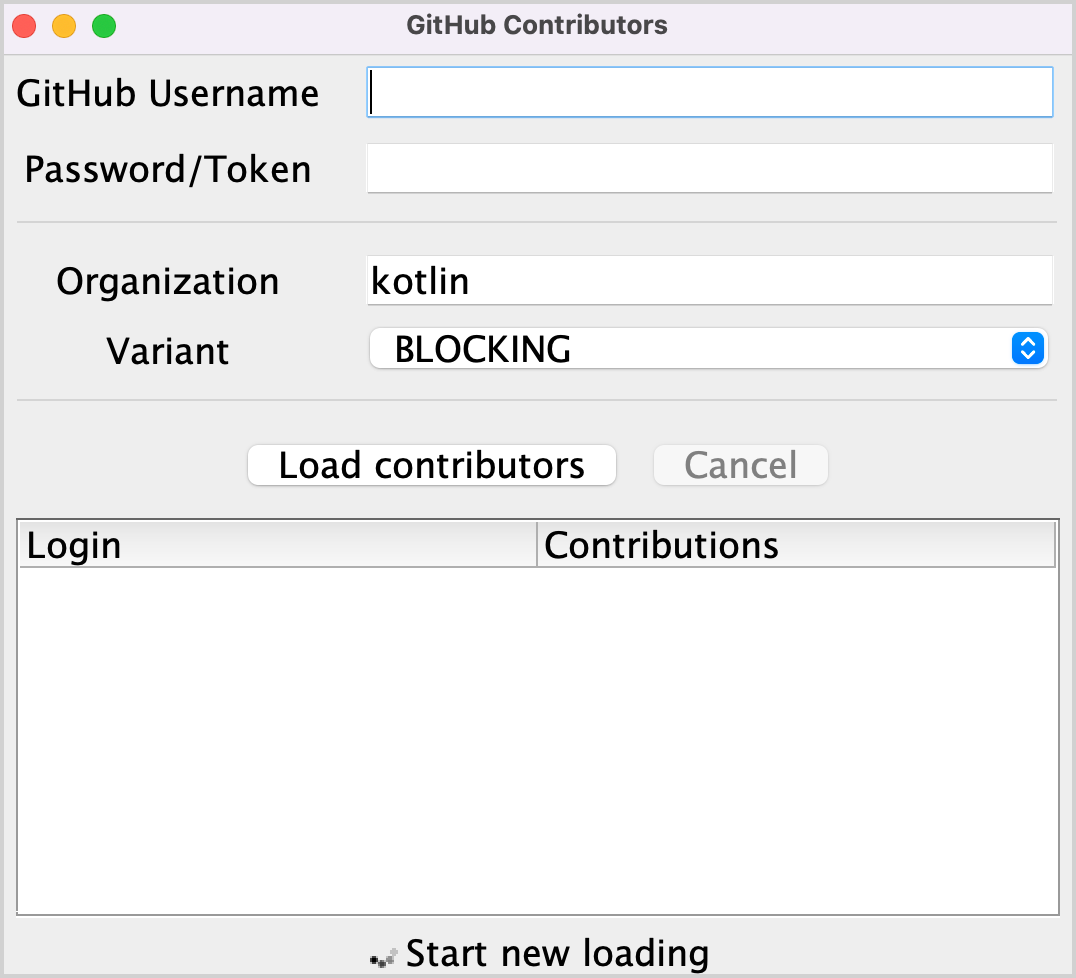 이 로그 출력은 모든 결과가 메인 스레드에서 기록되었음을 보여줍니다. BLOCKING 옵션을 사용하여 코드를 실행하면 창이 정지하고 로드가 완료될 때까지 입력에 반응하지 않습니다. 모든 요청은 loadContributorsBlocking()에서 호출되는 스레드와 동일한 스레드에서 실행됩니다. 이 스레드는 주요 UI 스레드입니다 (Swing에서는 AWT 이벤트 디스패칭 스레드입니다). 주요 스레드가 차단되고 UI가 정지되는 이유입니다.