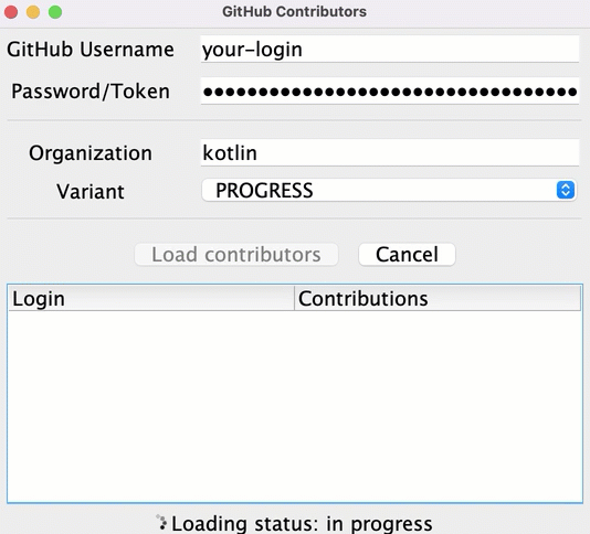 1. src/contributors/main.kt 파일을 열고 main() 함수를 실행합니다. 다음 창이 표시됩니다.