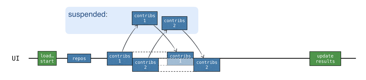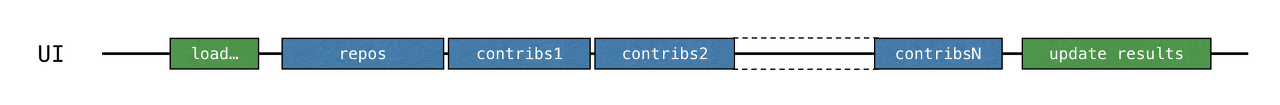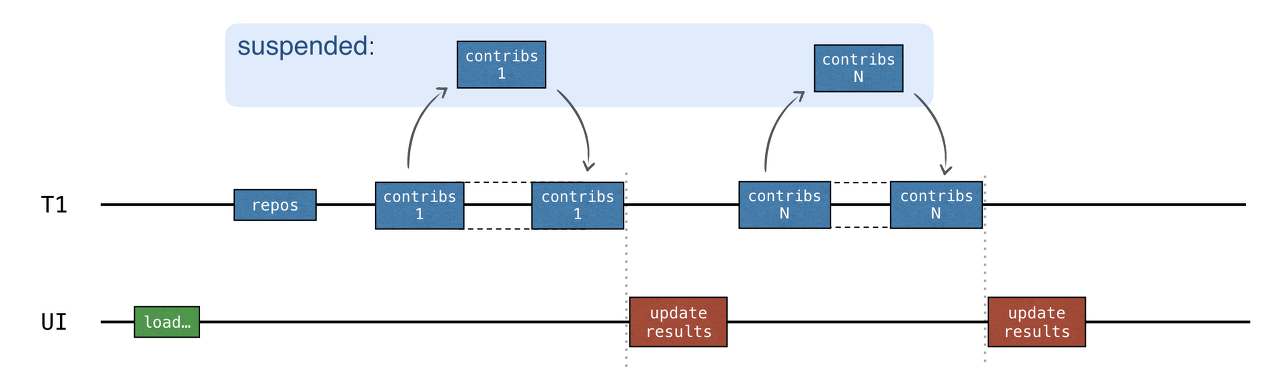 - 다른 저장소에 대한 결과는 준비되자마자 채널로 추가되므로 처음에는 모든 요청이 전송되고 데이터가 수신되지 않는 상태에서 receive() 호출이 일시 중단됩니다. 이 경우 "기여자 로드" 코루틴 전체가 일시 중단됩니다.