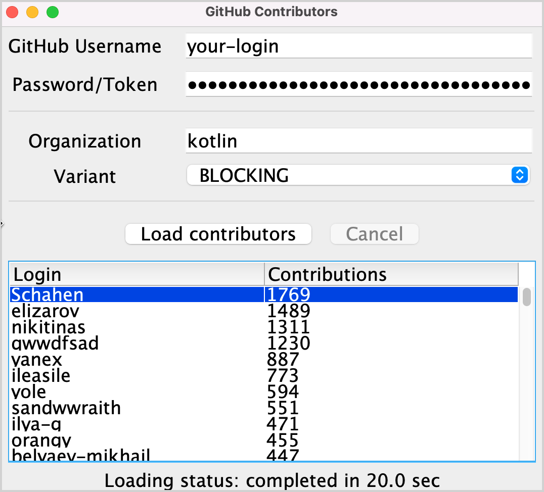 프로그램은 주어진 기관(기본적으로 "kotlin"이라고 함) 아래의 모든 저장소에 대한 기여자를 로드합니다. 나중에 기여자를 기여한 횟수에 따라 정렬하는 로직을 추가할 것입니다.