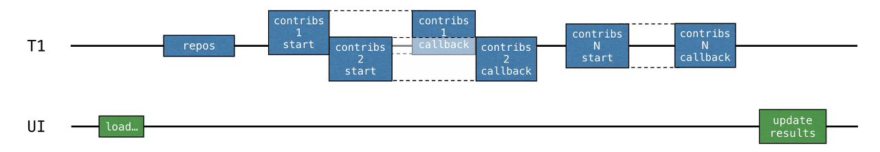 - loadContributorsBlocking()도 UI 스레드에서 호출되므로 UI 스레드가 차단되고 UI가 정지됩니다.