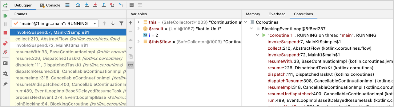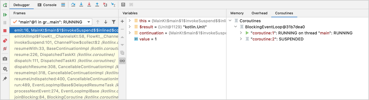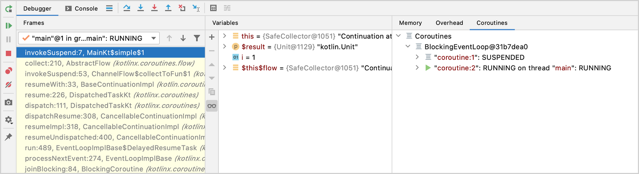 Coroutines 탭에서 두 개의 코루틴이 동시에 실행되고 있는 것을 볼 수 있습니다. buffer() 함수 덕분에 발신자와 수집기가 별개의 코루틴에서 실행됩니다. 발신자 코루틴은 RUNNING 상태이며 수집기 코루틴은 SUSPENDED 상태입니다.