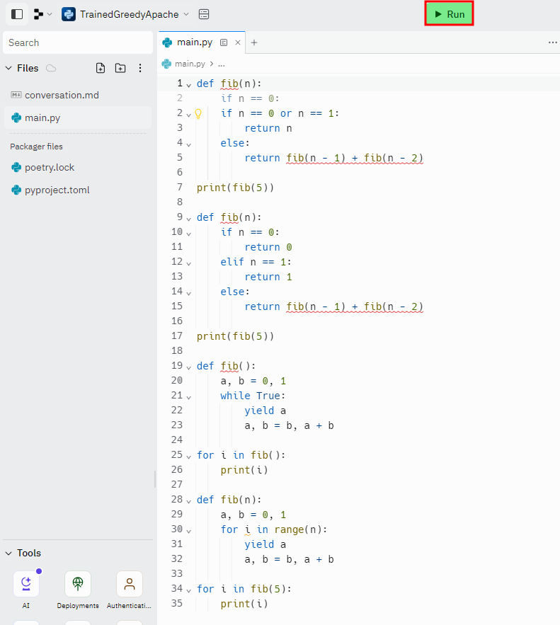 replit은 colab 처럼 문서형태가 아니라 단순하게 코드만 실행하는 구조라 답변에 있는 코드가 모조리 하나의 실행창에 들어간다.