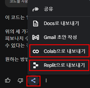 파이썬으로 답변이 온 경우 해당 답변 맨 아래에 있는 공유 아이콘을 눌러서 Colab, Replit (7월 13일에 추가)으로 코드를 보낼 수 있다.