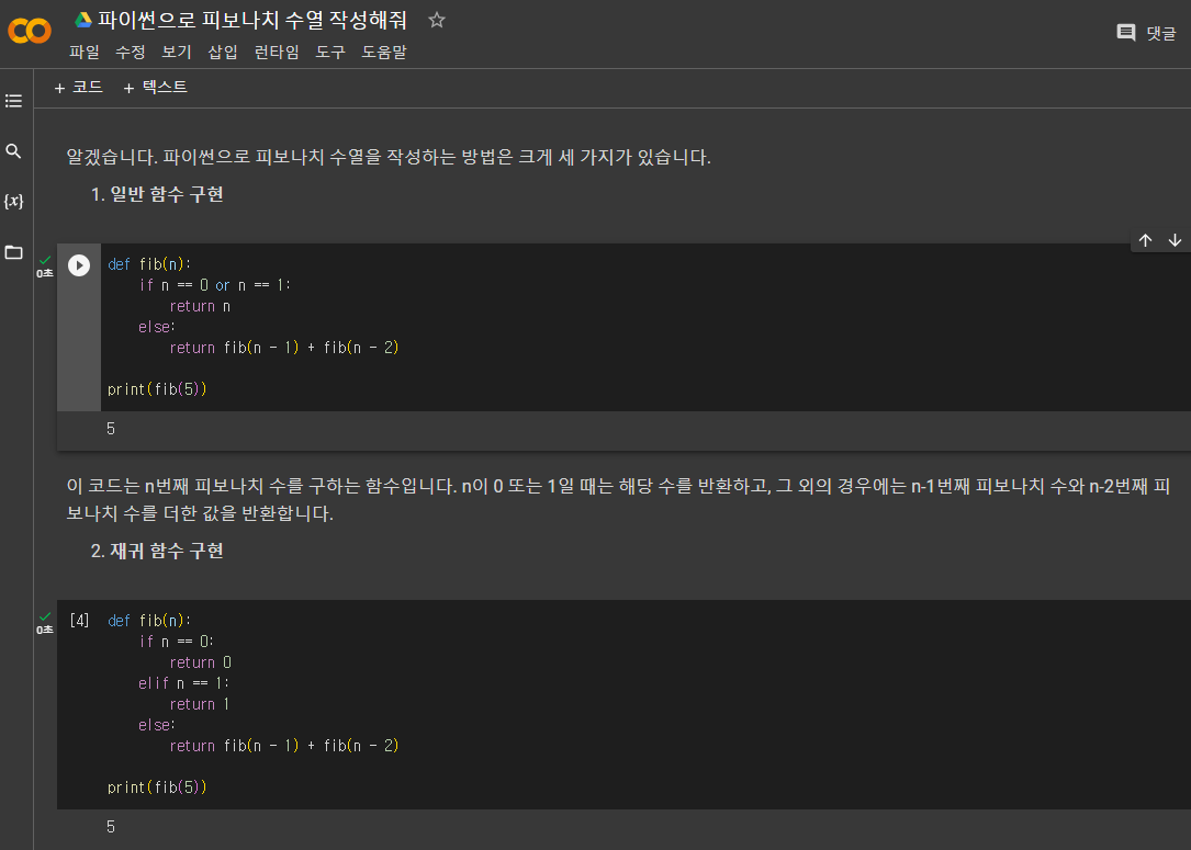 이제 Bard에서 20개가 넘는 프로그래밍 언어로 코딩할 수 있습니다. Bard에서 Python 코드를 생성하면 Google Colab으로 바로 코드를 내보내고 테스트할 수도 있습니다. C++, Go, Java, JavaScript, Python, TypeScript, Google Sheets 함수와 같은 언어에 대한 도움을 받으려면 Bard에게 도움을 요청해 보세요.