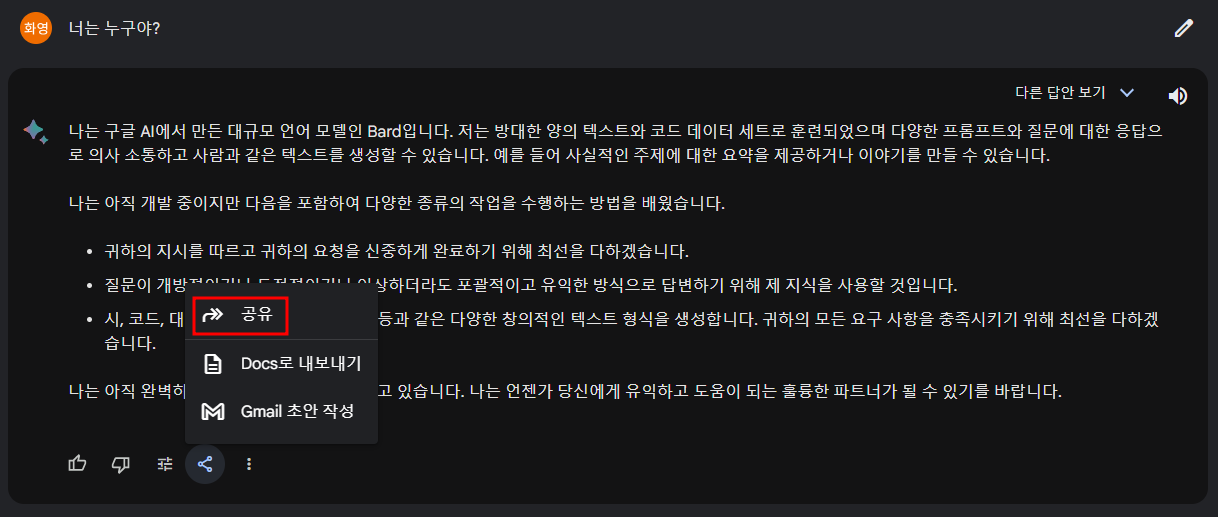 바드에게 질문한 후 하단에 공유 아이콘을 누르고 공유를 클릭해자.