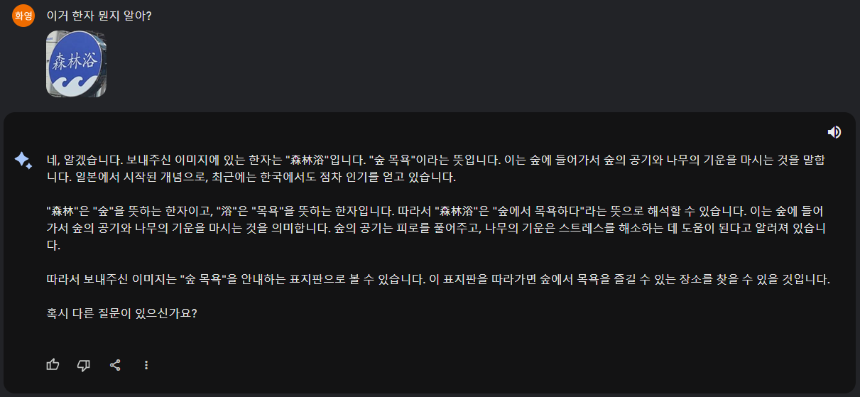 숲 목욕이라는 한자란다. 저걸 똑같이 ChatGPT에 물어봤는데 엉뚱한 한자를 자꾸 답하길래 짜증나서 껐는데 바드는 역시 구글 거라 그런지 이미지 분석은 기똥차게 해낸다.