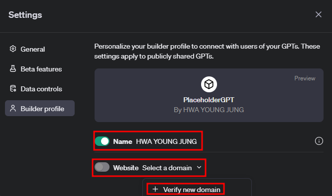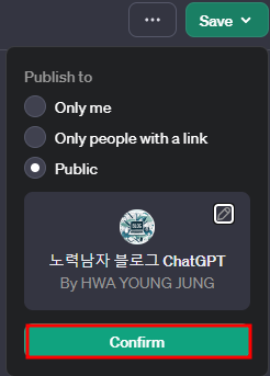 3. GPT Store에 등록하기 (아직 GPT Store은 출시되지 않았다. 이걸로 설정하면 나중에 GPT Store 생겼을 때 보여지나보다.)