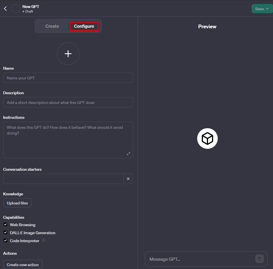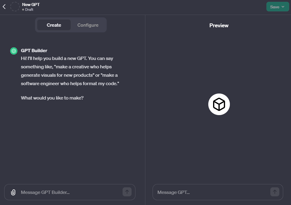 GPT Builder 첫 화면이다.