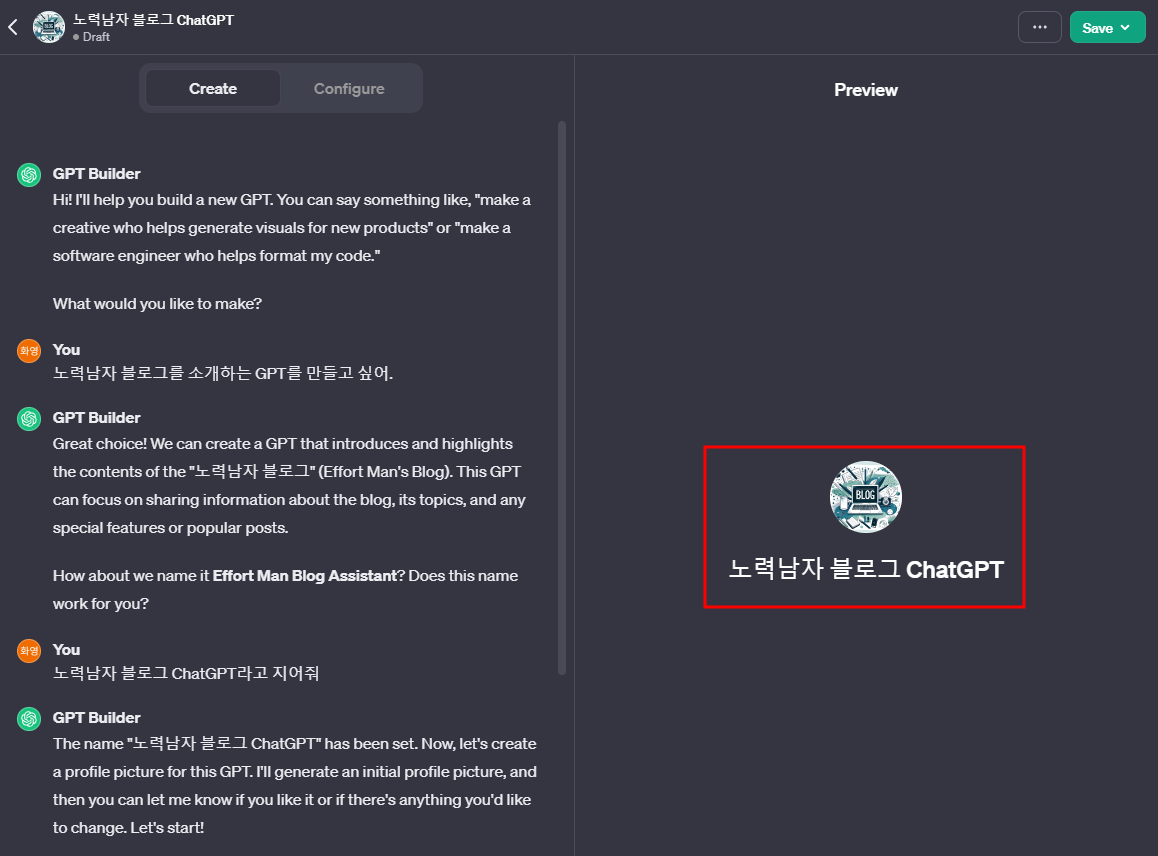 GPT Builder와 대화를 해서 GPT를 만들 수 있다.