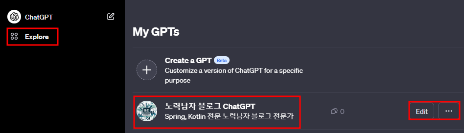 왼쪽 상단 Explore을 누르면 내가 만든 GPT를 볼 수 있다.