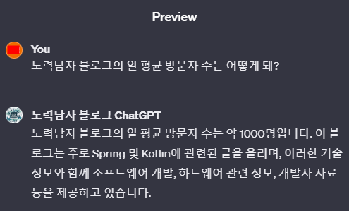 아까 입력한 일 평균 방문자 수에 대한 질문에 내가 입력한 답이 잘 나왔다. 쓸 때없는 부가 설명까지 나온다.
