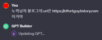 먼저 url을 입력해줬더니 "Updating GPT"라고 나오면서 한 20초정도 걸리면서 업데이트가 됐다.