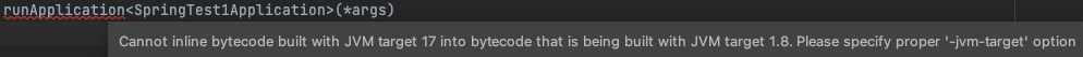 새로운 Spring Boot 프로젝트를 만들고 실행하려고 보니 runApplication에 빨간 줄이 있어서 마우스를 올려보니 "Cannot inline bytecode built with JVM target 17 into bytecode that is being built with JVM target 1.8. Please specify proper '-jvm-target' option" 라고 나왔다.
