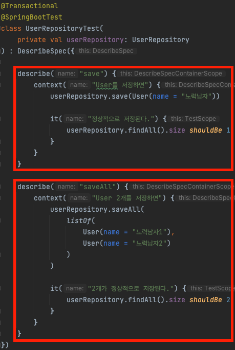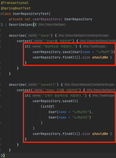 이번 포스팅에선 Kotest로 작성된 테스트 코드에서 @Transactional을 사용하는 방법에 대해 알아보겠다.