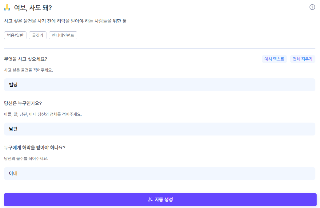 AI 스토어 1위인 "여보, 사도 돼?"를 눌러서 작성해보겠다.