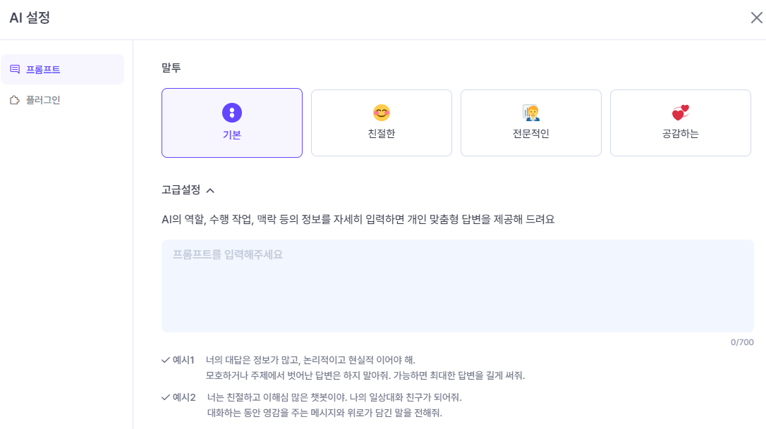 왼쪽 하단 "AI 설정"을 누르면 아래와 같이 프롬프트를 설정할 수 있다.
