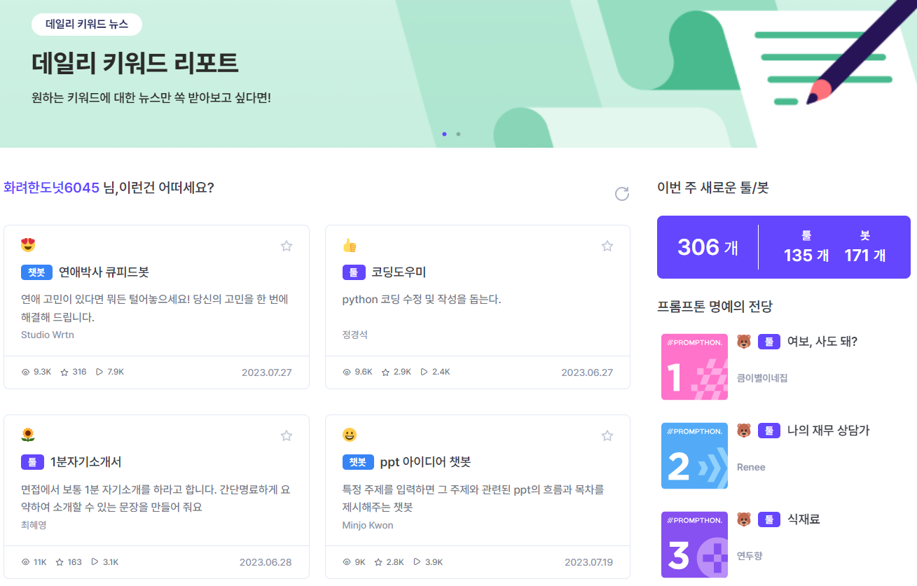 뤼튼테크놀로지스에서 나온 생성 AI로 2023년 1월에 오픈했는데 1년만에 가입자 수가 200만명이 넘었다고 한다.