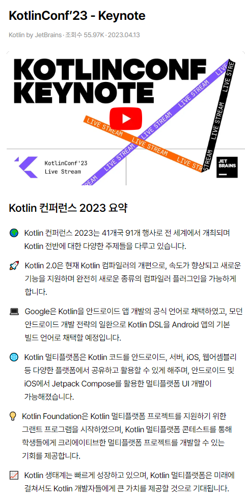코틀린 컨퍼런스 2023에서는 코틀린의 성장과 다양한 활용 방안에 대해 소개합니다. 안드로이드 앱 개발부터 멀티플랫폼, 데스크톱, 서버, iOS까지 다양한 플랫폼에서의 활용 가능성을 제시하며,