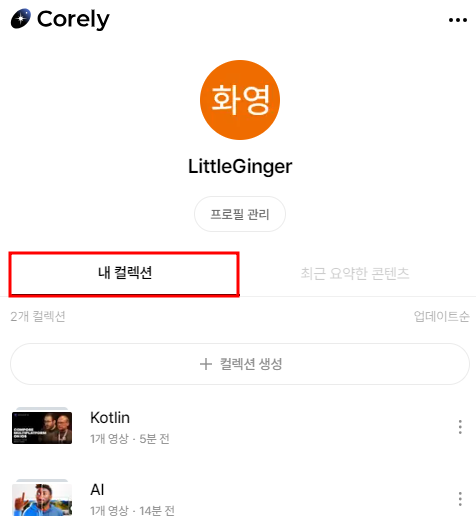 저장한 컬렉션은 우측 상단 프로필 -> 내 컬렉션 에서 확인할 수 있다.