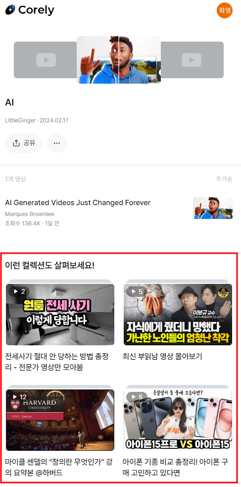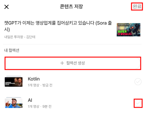 컬렉션 생성 -> 체크 버튼 클릭 -> 오른쪽 상단 완료 클릭 순으로 영상 요약을 관리할 수 있다.