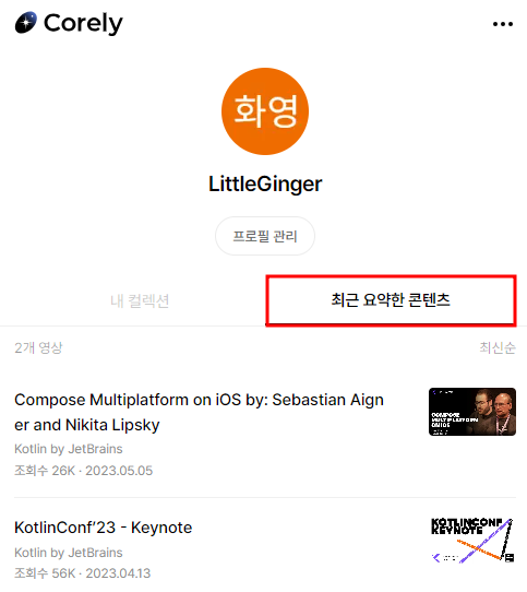 영상 요약이 끝나면 오른쪽 상단 프로필 클릭 -> 최근 요약한 콘텐츠에 추가가 된다. 편하게 꺼도 된다.
