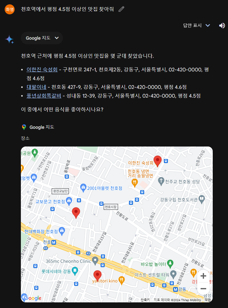 내가 질문한 내용을 Google Map에서 찾아준다.