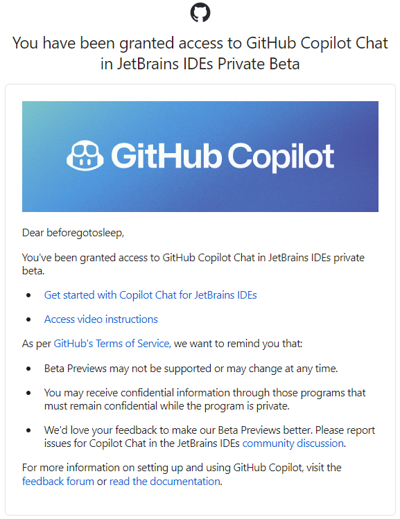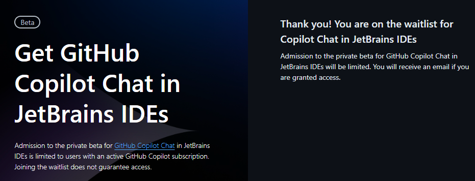 GitHub Copilot Chat 사용 신청 페이지에 들어가서 "Join Chat in JetBrains waitlist"를 클릭