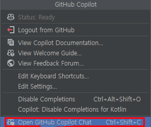 만약 GitHub Copilot 플러그인을 설치 안 했거나, GitHub 계정 연동을 안 한 경우엔 IntelliJ에서 Copilot 사용하는 방법 포스팅을 참고 바란다.