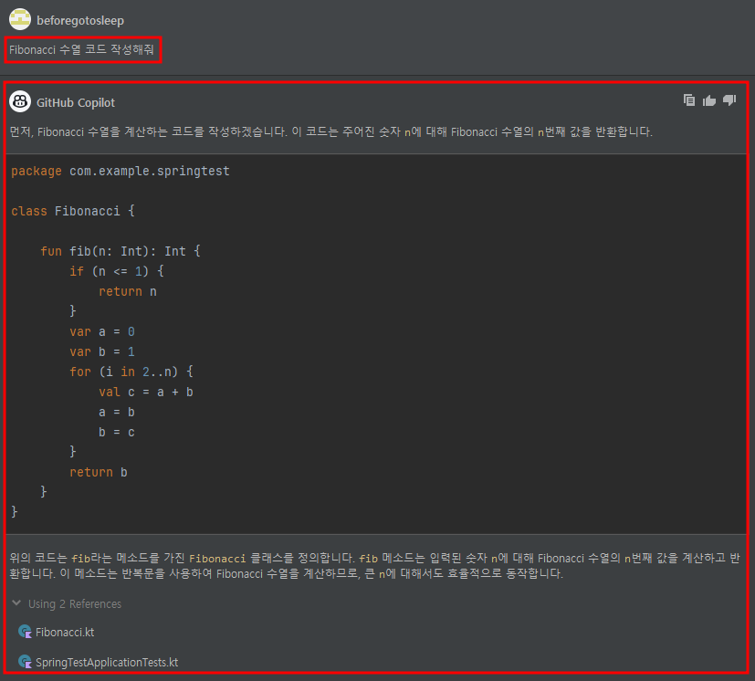 반면에, GitHub Copilot Chat은 내가 원하는 코드에 대한 설명을 대화로 풀어낼 수 있다. ChatGPT랑 동일하다고 생각하면 빠르다.