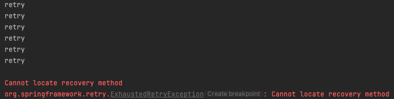 maxAttempts만큼 실행이 추가로 되고 "org.springframework.retry.ExhaustedRetryException: Cannot locate recovery method' 에러가 발생한다.