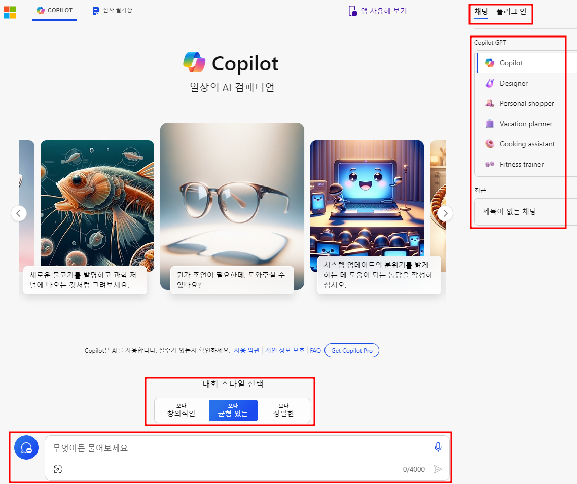 그 위엔 대화 스타일을 선택할 수 있다. 각 스타일마다 정말 다른 건지 모르겠다.