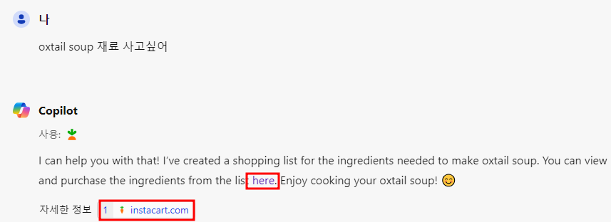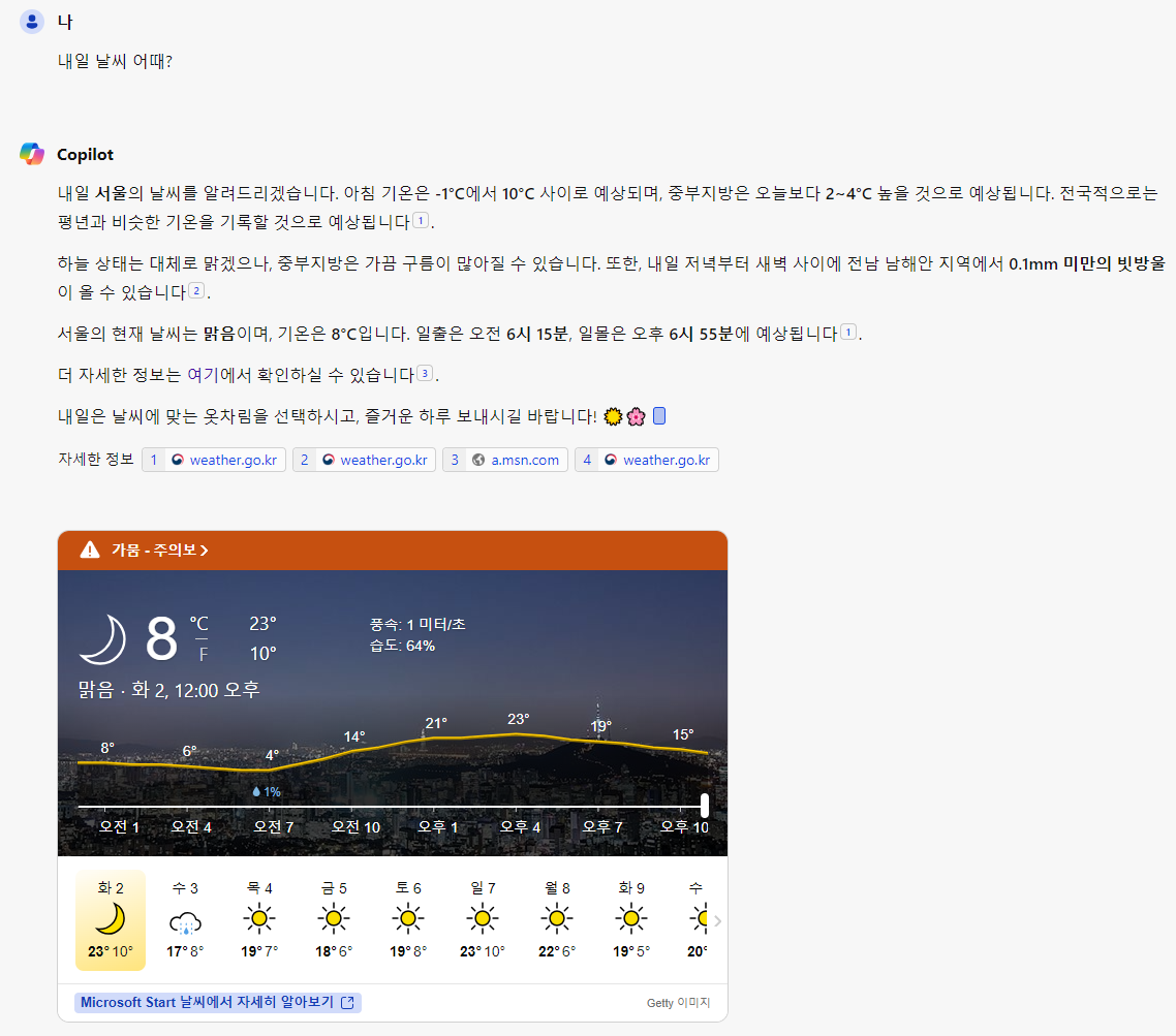 학습된 내용에서 답해줄 때도 있고, Bing에서 실시간 검색해서 알려줄 때도 있다.