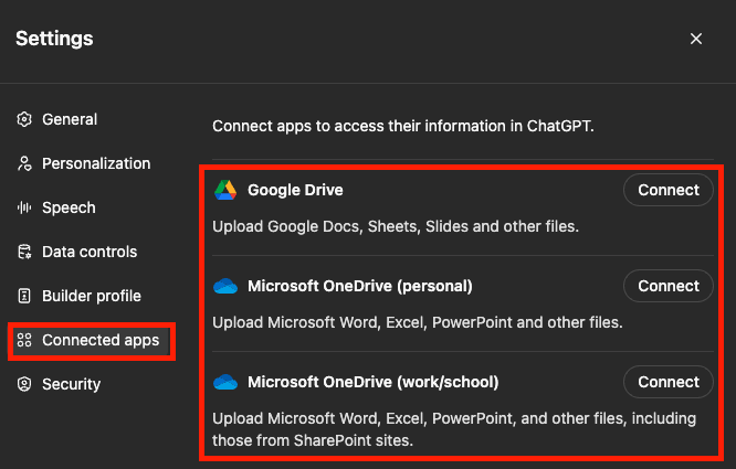 2. Connected apps 클릭 -> Google Drive, Microsoft OneDrive 중 연결하고 싶은 곳의 Connect 버튼 클릭