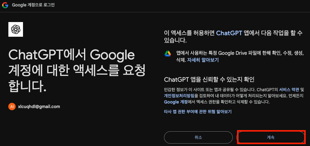 Google Drive Connect 누른 후 로그인하면 아래와 같이 나온다.