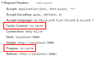 바로 헤더의 Pragma, Cache Control의 값을 no-cache 설정해주는 겁니다.